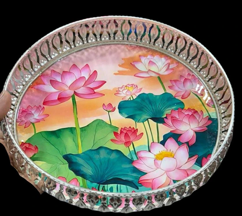 Elegant decorative plate featuring a beautiful lotus flower design with a glossy printed finish and stylish cutwork border. Perfect for pooja rituals, festive serving, home décor, and return gifting.